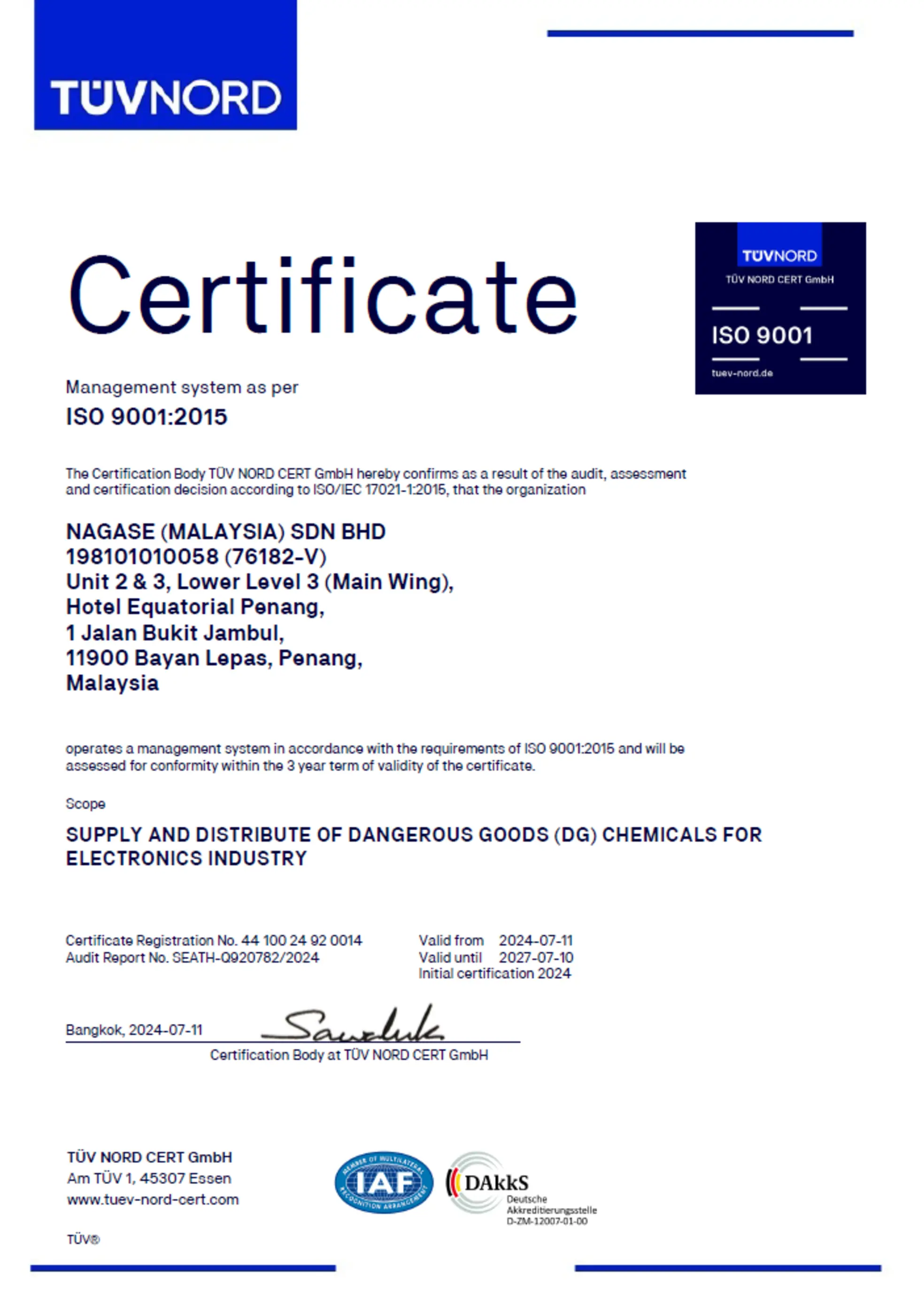 In response to the increasing quality expectations from our valued semiconductor & electronics related customers, Nagase Malaysia’s Penang Electronics team is proud to announce that we have been awarded the ISO 9001:2015 Quality Management System certification with the scope: SUPPLY AND DISTRIBUTE DANGEROUS GOODS (DG) CHEMICALS.