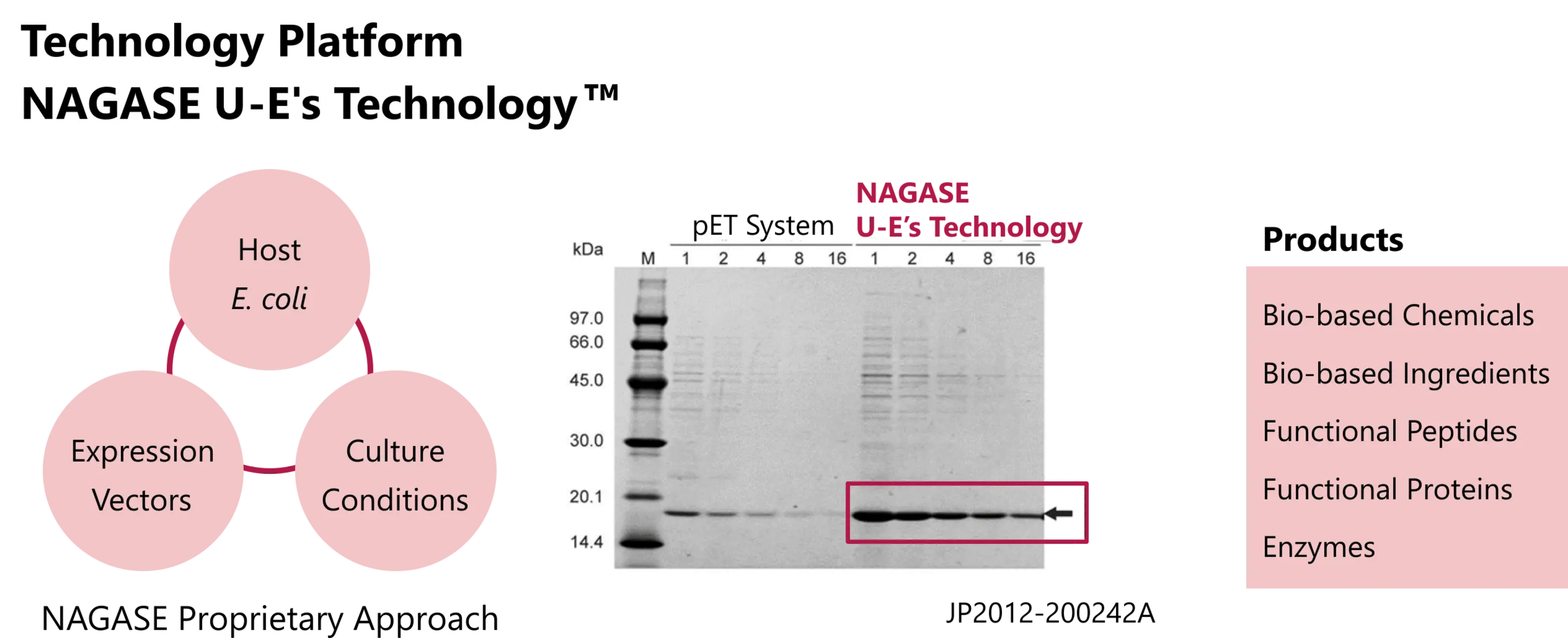 Building on these experiences, we continue to offer our proprietary E. coli-based protein production through “ NAGASE U-E’s Technology™ ” to a wide range of customers.