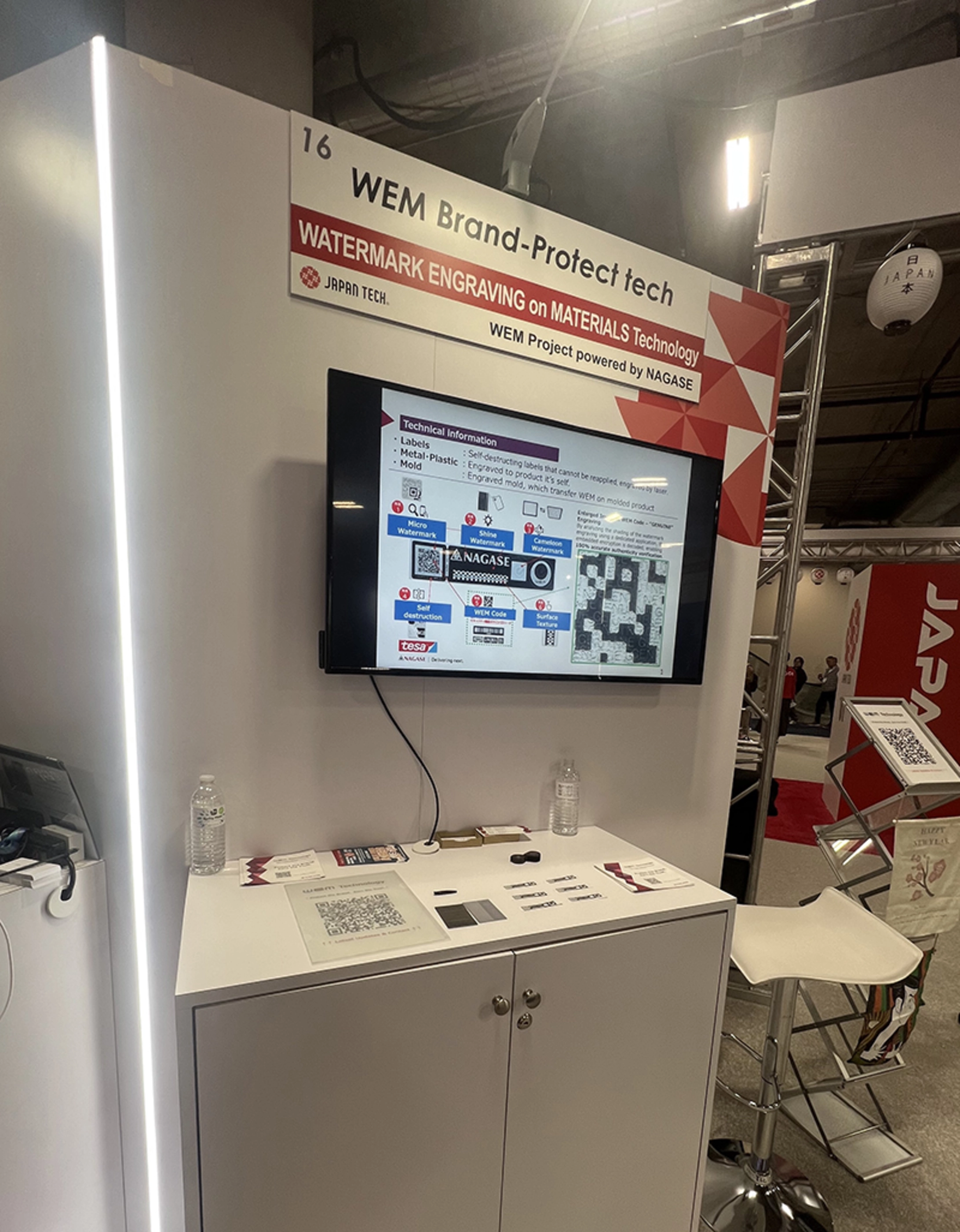 会場では、レーザーによる三次元微細加工を用いたWEM® Technologyの特長や、製品の意匠を損なわずに高い真贋判定精度を実現する点を、実サンプルを用いて紹介しました。樹脂や金属など多様な素材への適用可能性についても説明を行っています。
