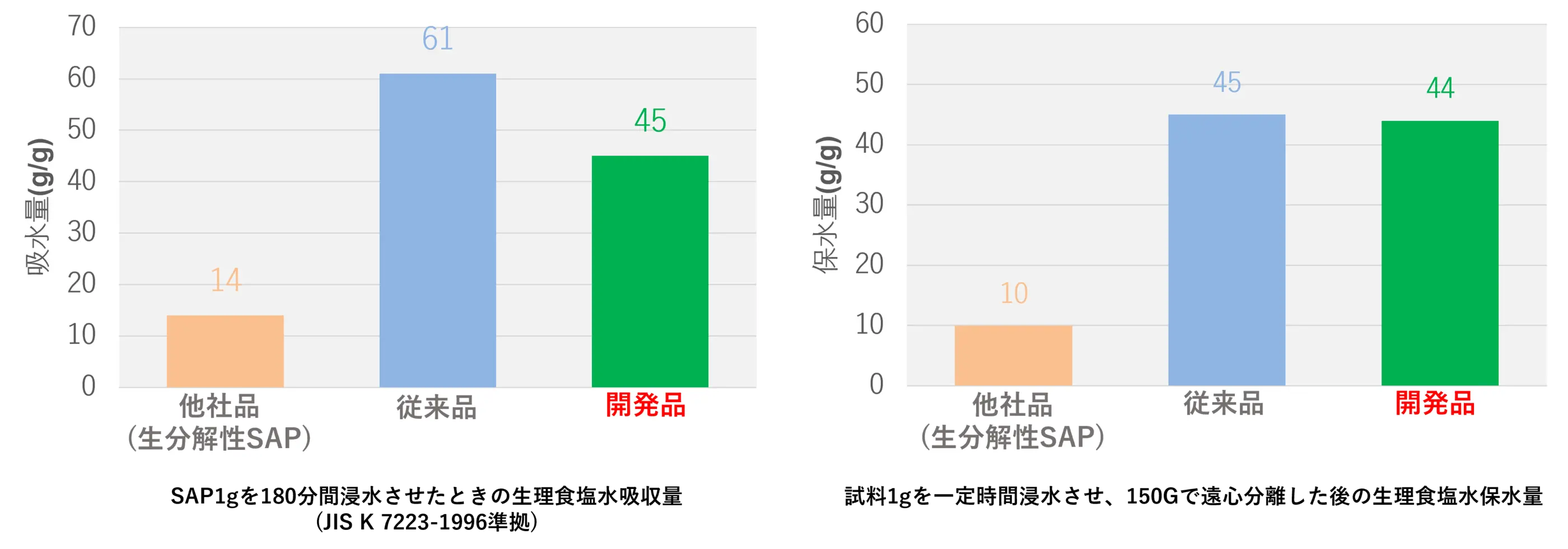 他社品の生分解性SAP、従来のポリアクリル酸SAPとの比較