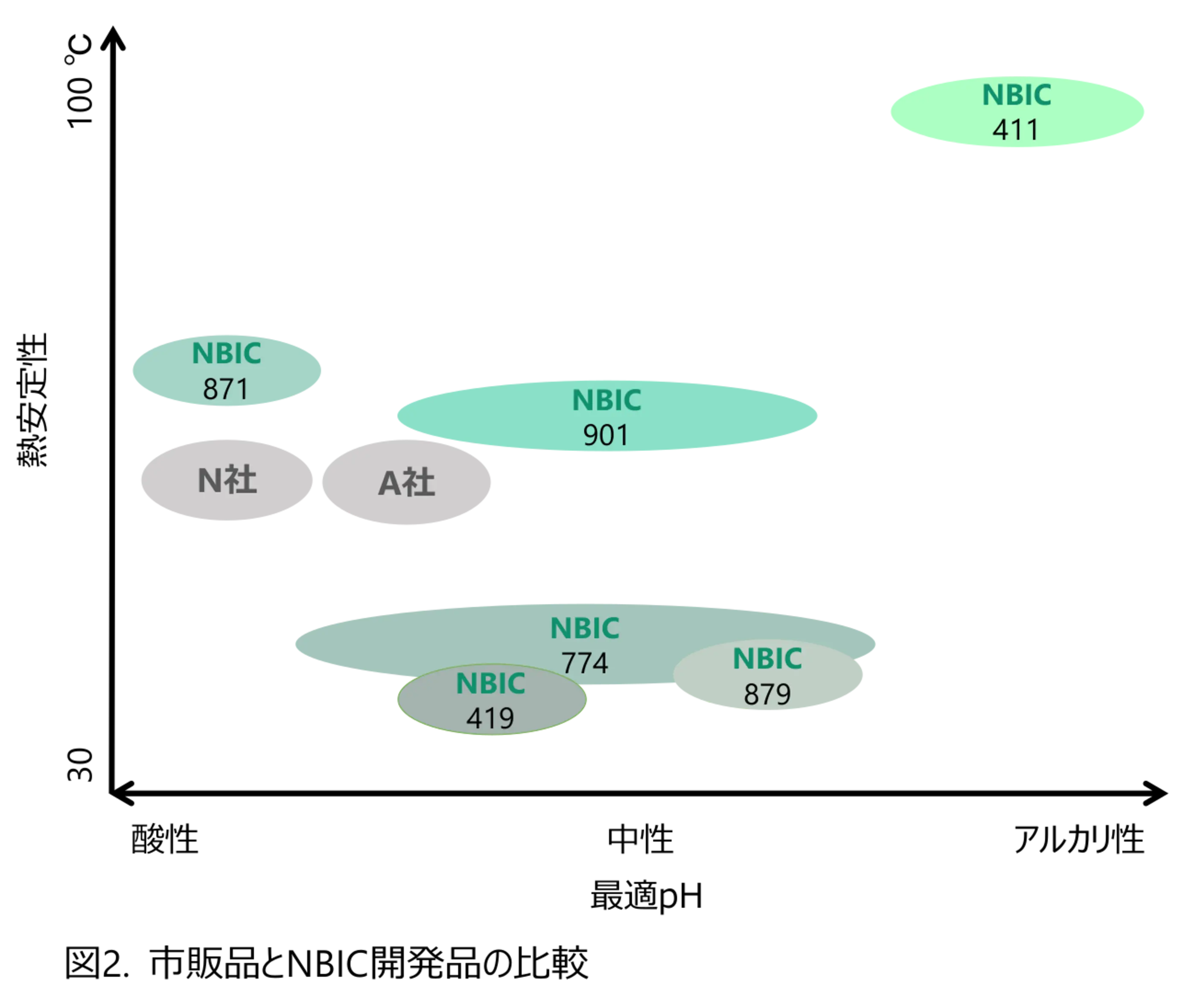 NBICでは豊富な遺伝子資源を有する放線菌に着目し、N-STePP®技術を活用してラッカーゼの開発を進めてきました。興味深いことに、同じ放線菌属でもラッカーゼのキャラクターは全く異なることが分かってきました。作用pHは酸性~強アルカリまで。耐熱性は40℃から95℃まで耐えるものまで十人十色の特徴を示しました(図2)。