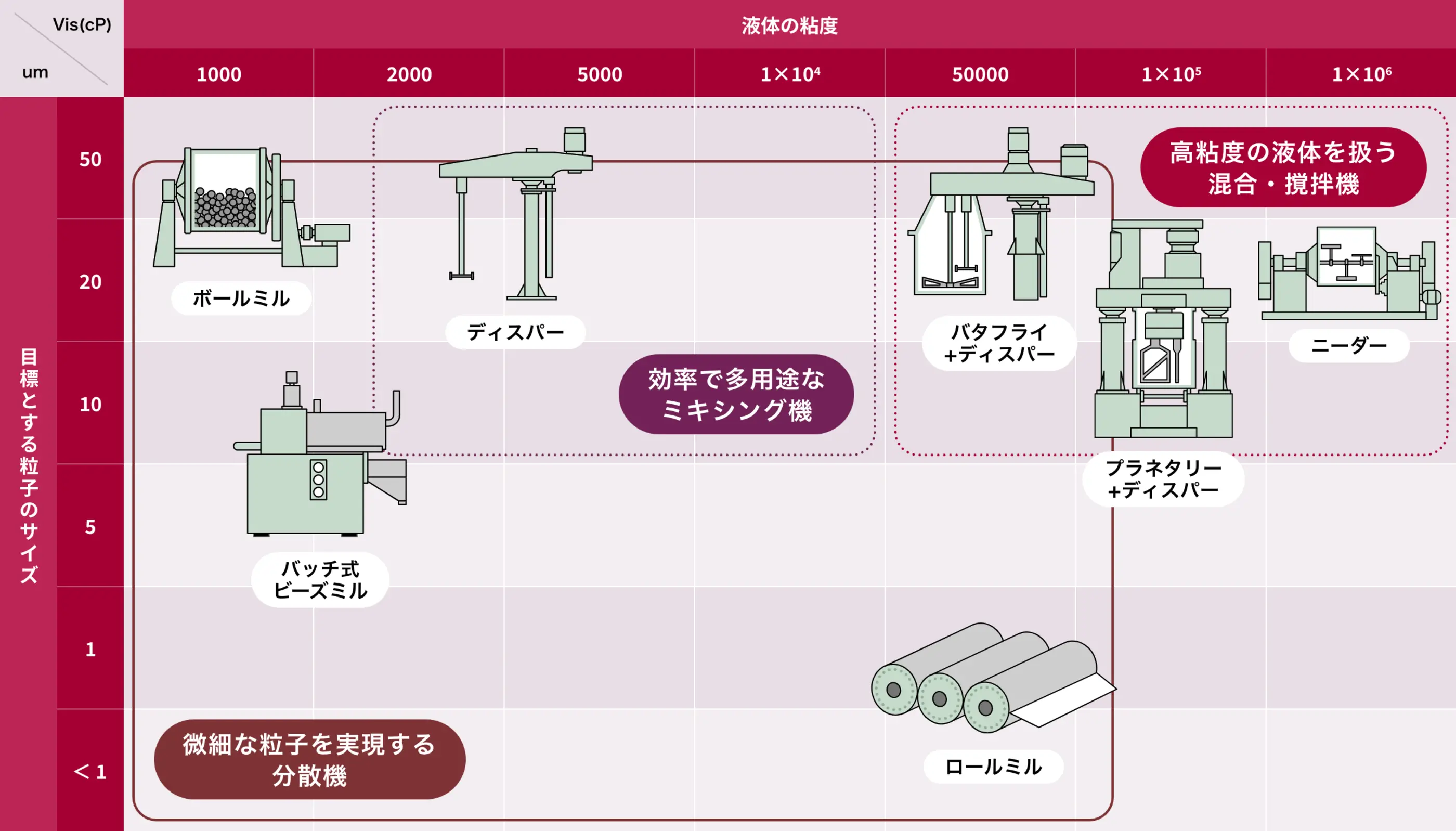 ボリューム、スペック、粘度と粒子サイズに応じて、最適な分散・混合攪拌装置を提案します。