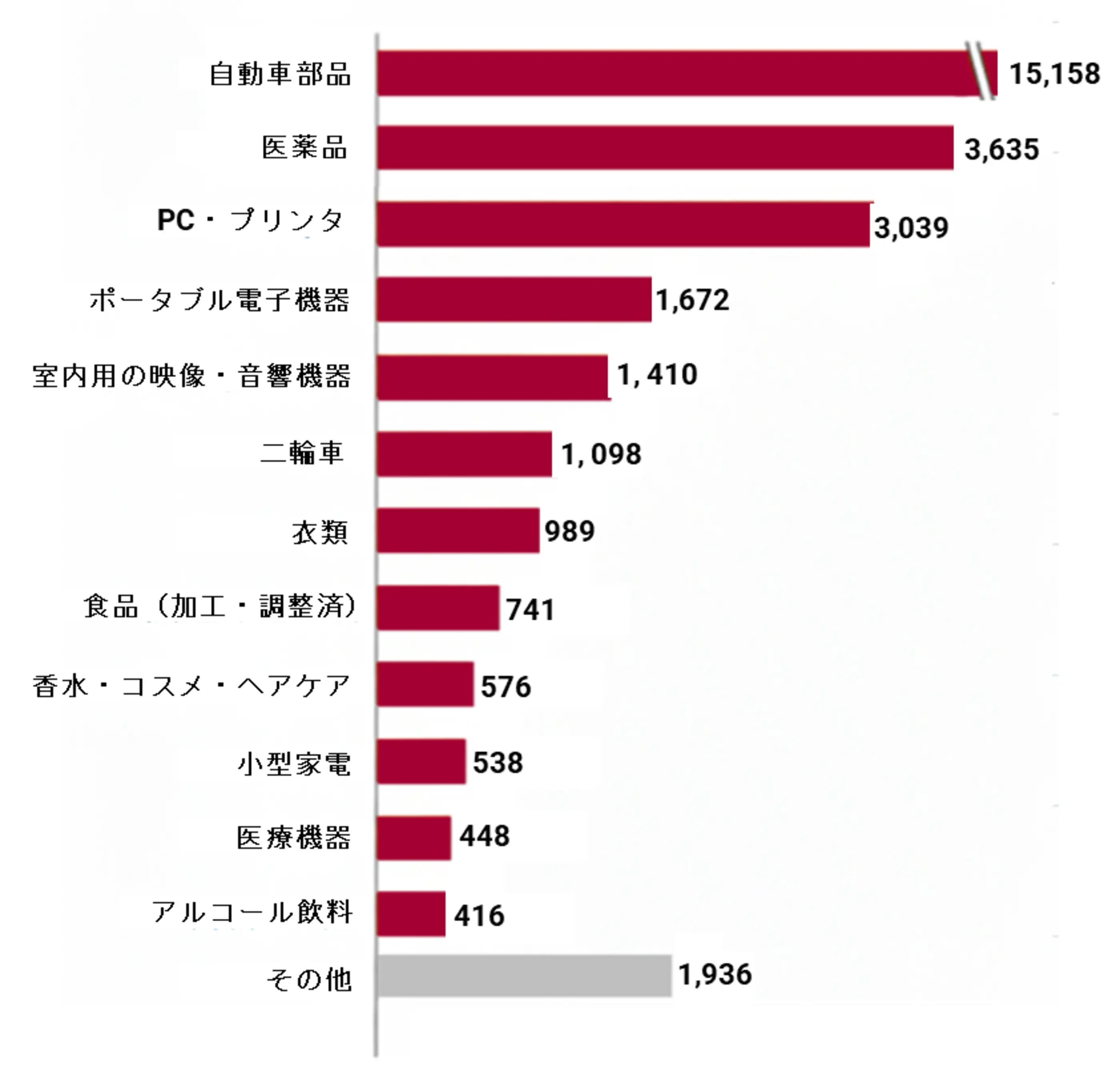 例:自動車部品、酒、電子機器