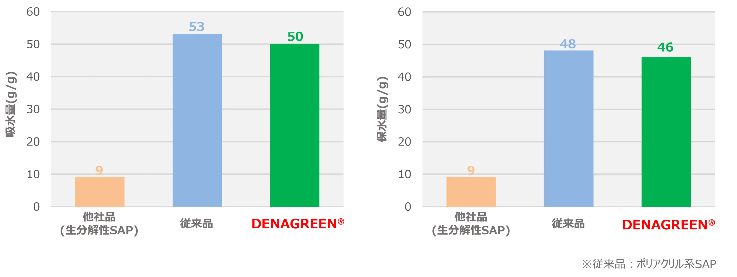 DENAGREEN®はでんぷん由来の吸水性素材です。再生可能なバイオ由来原料を使用した生分解性を持ち、従来の石油由来の高吸水性ポリマー(SAP)に比べ、環境にやさしく、優れた吸水性能を実現しました。特に塩水に対する吸水力が高く、衛生用品や農業、緑化など幅広い用途に対応します。サステナビリティに配慮した製品として、持続可能な衛生材料を目指すお客さまに応えるソリューションです。