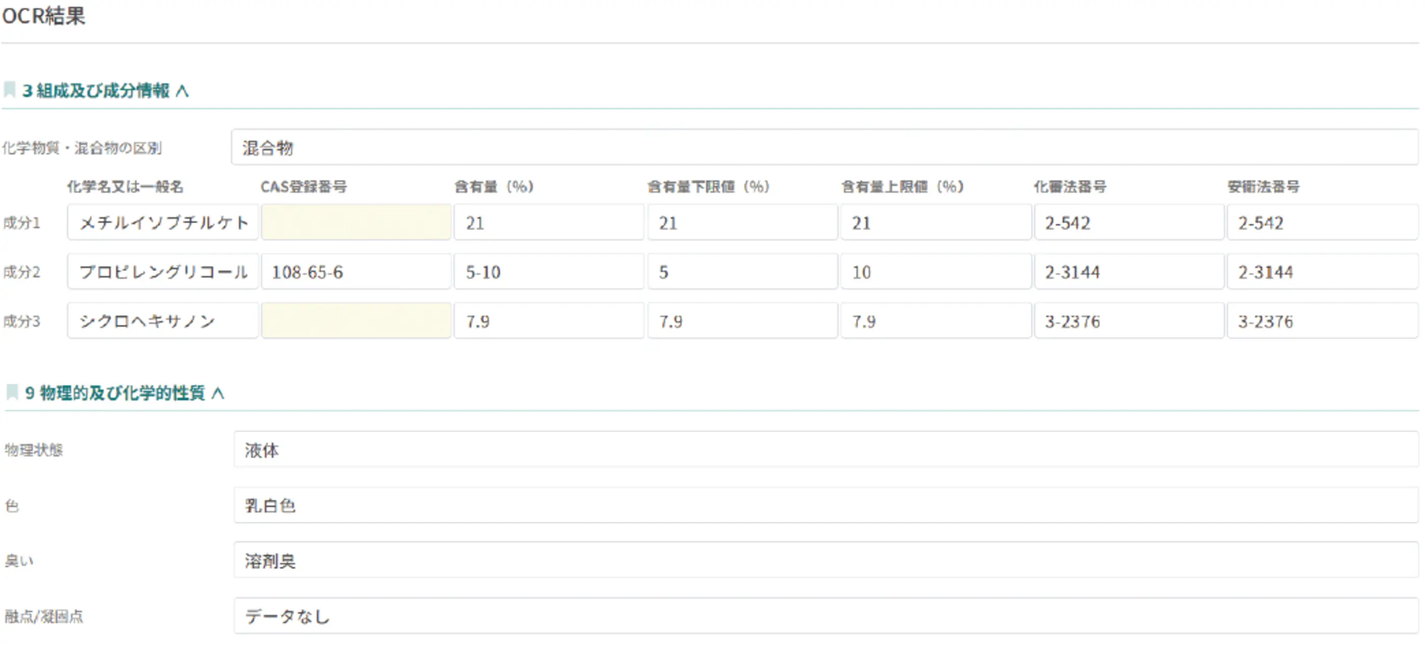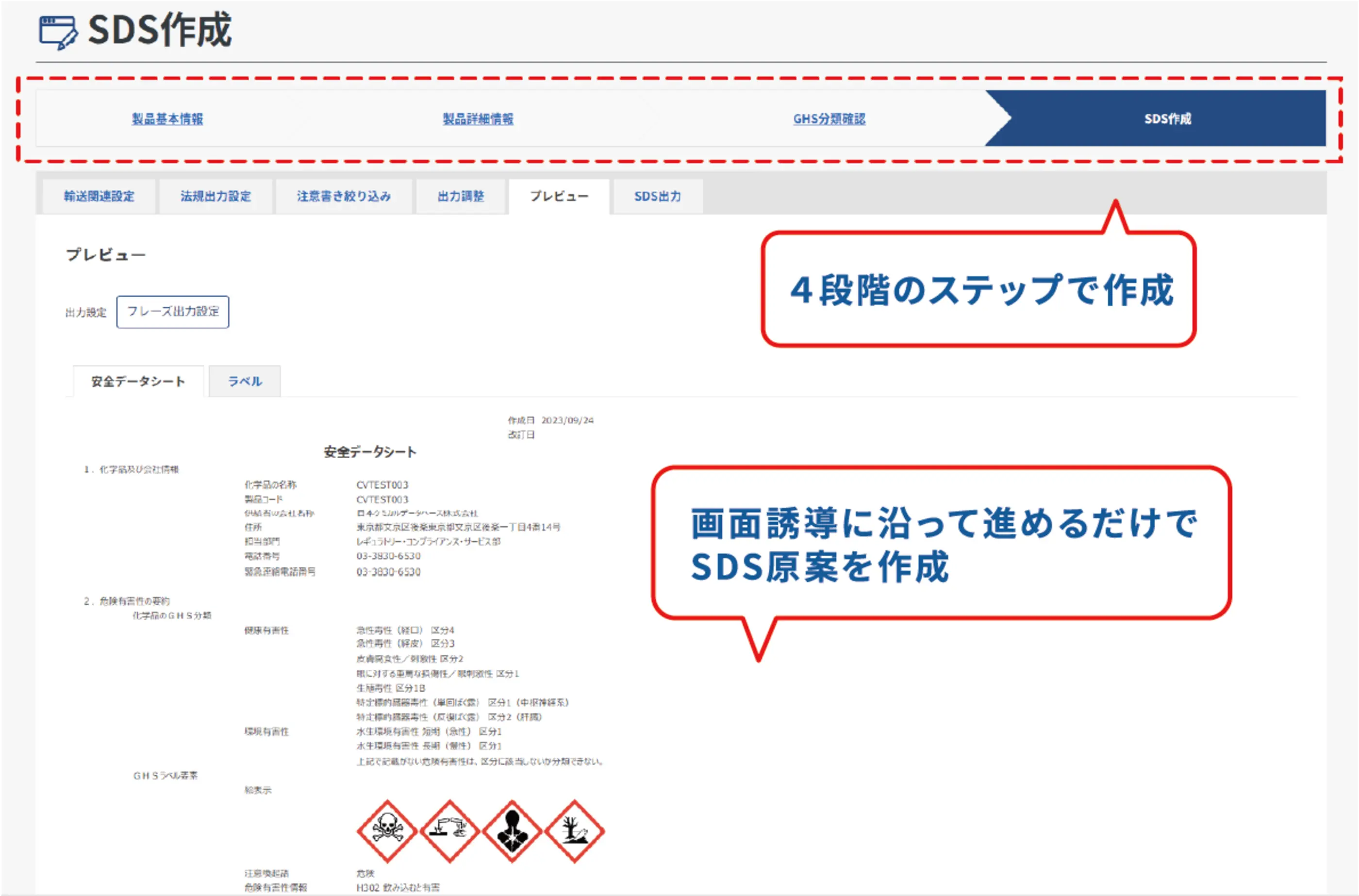 - 法規制の自動判定機能や原料管理機能、GHS分類判定、SDSの各章に適した候補フレーズの自動出力機能を搭載し、SDSの作成を支援