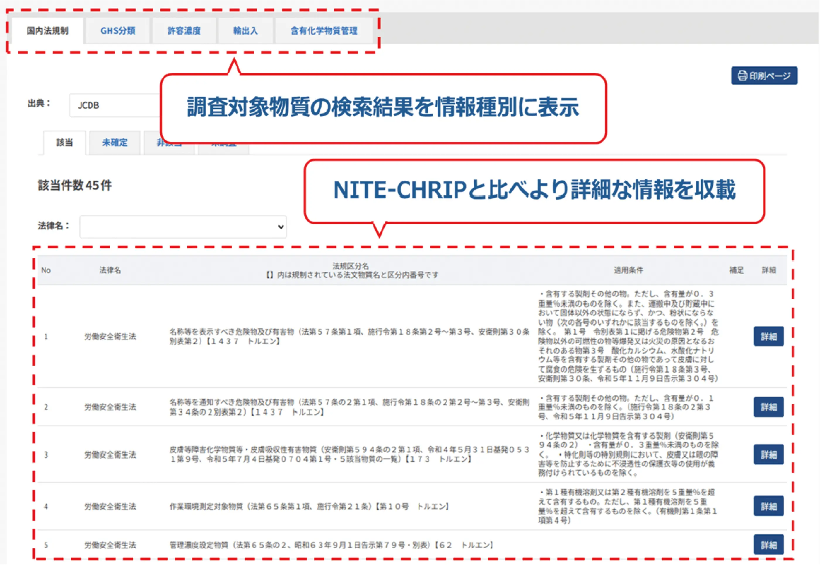 - 国内化学品関連 32 法規に加え、官報公示整理番号、国連番号などを収載し、物質名称(日本語 / 英語)、CAS 登録番号、化学式による様々な条件でスピーディーに目的の情報を検索