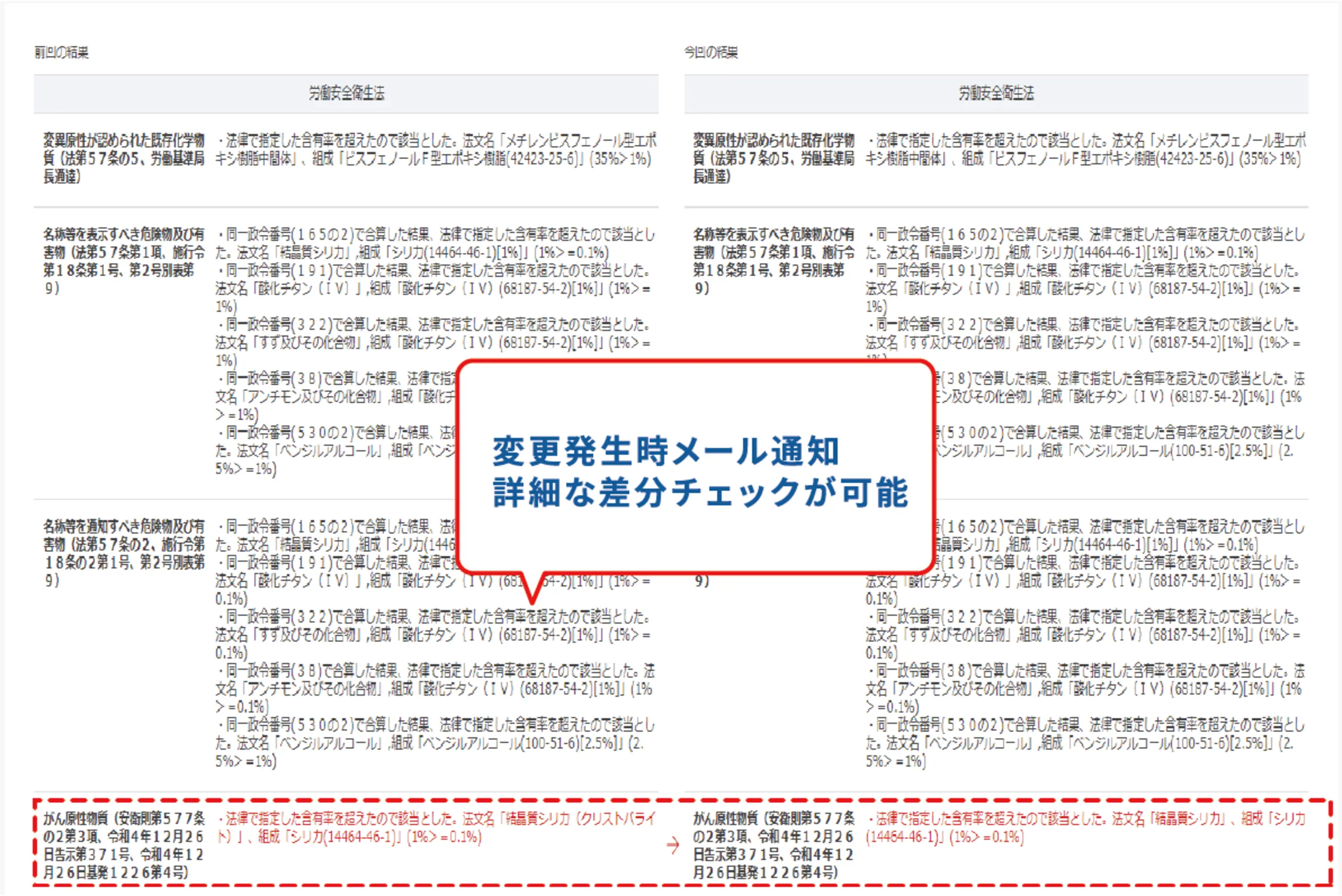 - 製品・物質・法律の 3 要素で変更情報をモニタリングし、法規制に変更があった場合に利用者へメールで通知