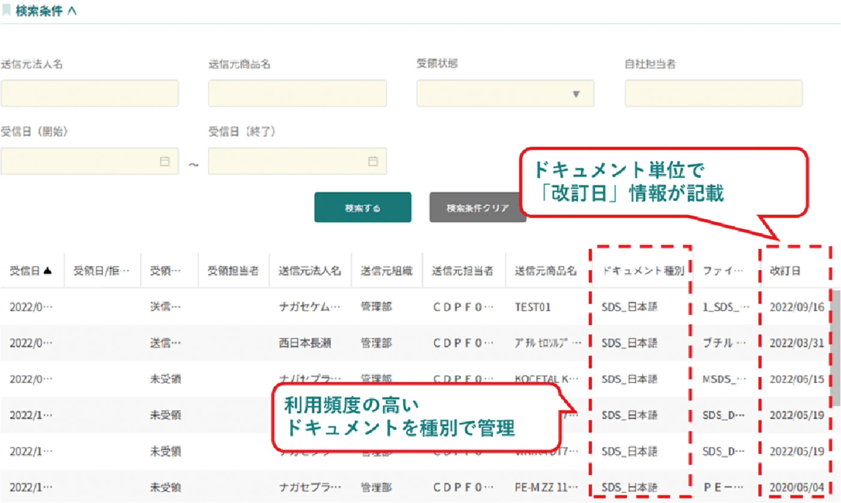例:別部署に公開出来ないドキュメント - ドキュメント単位で「改訂日」を保持する仕様により、最新版の保管状況が把握可能