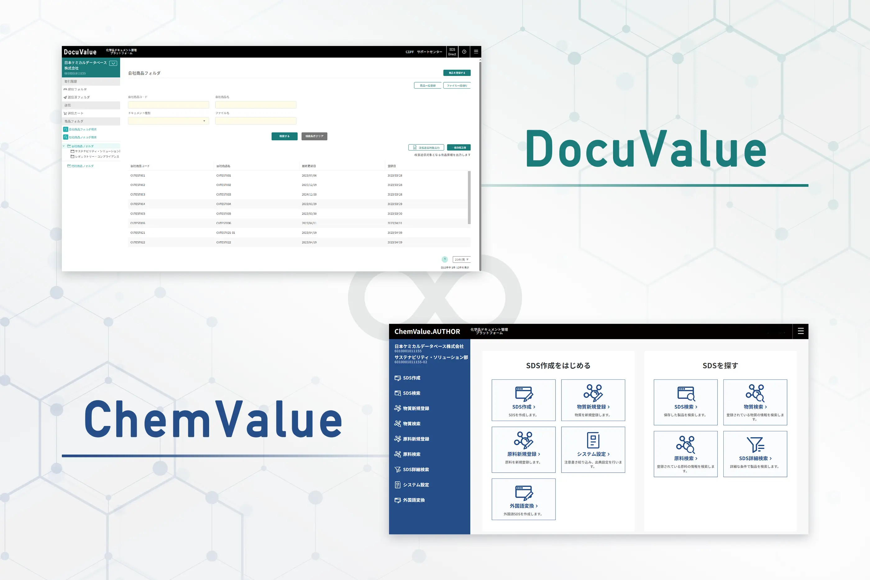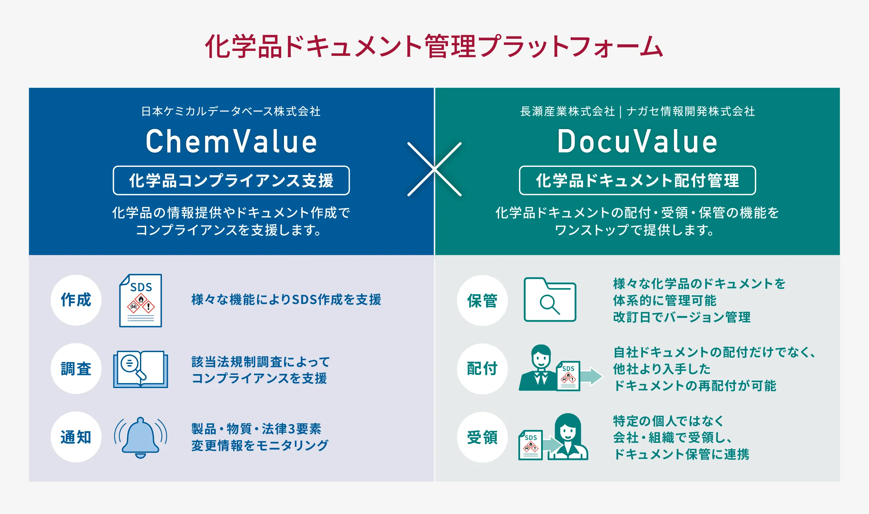 ドキュメント保管・配付・受領を管理する「DocuValue」とSDS作成業務の課題を解決する「ChemValue」で業務効率化をサポートします。