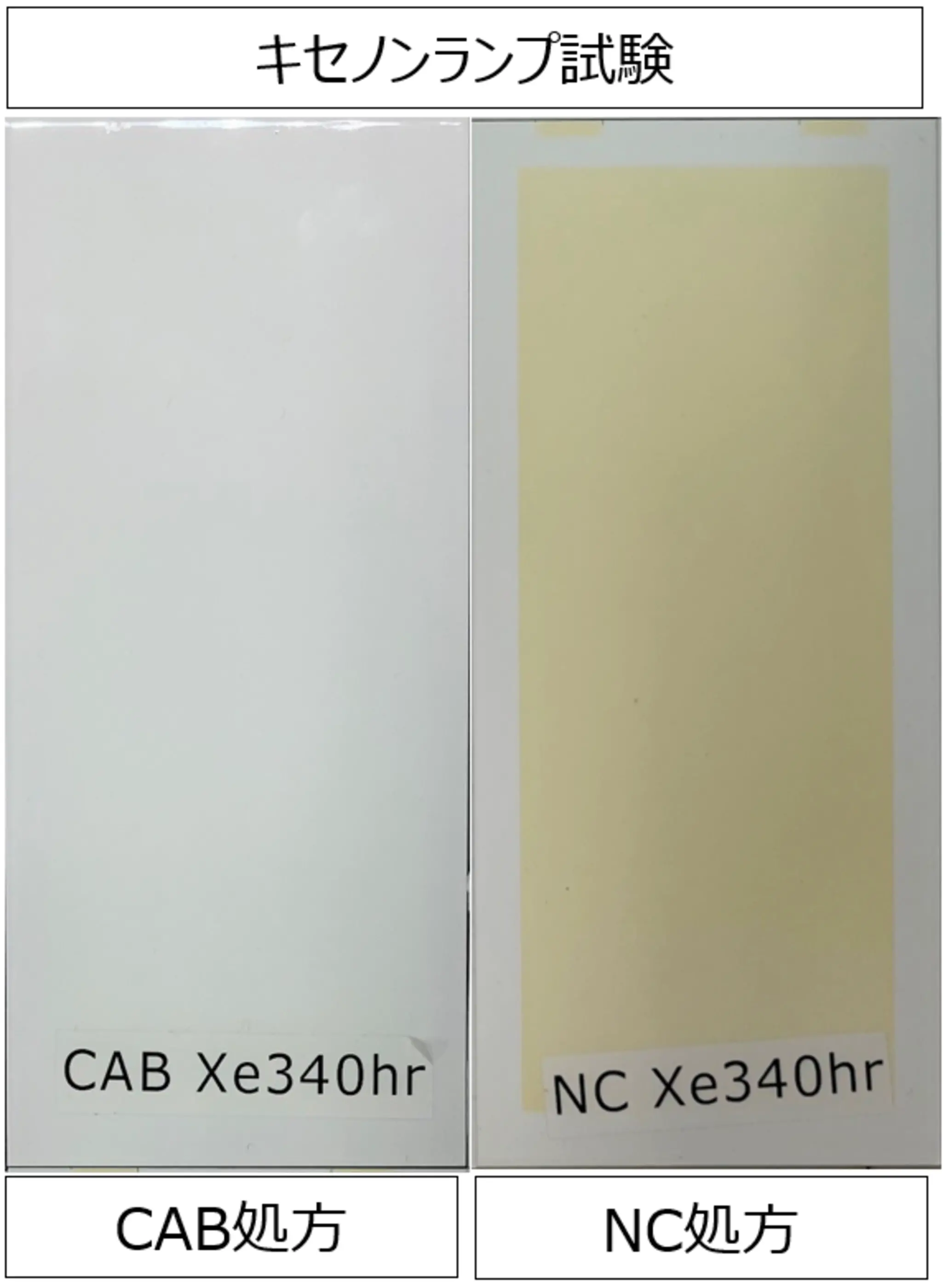当社ラボでセルロースエステル仕様(CAB処方)の塗板とニトロセルロース仕様(NC処方)の塗板の比較試験を実施