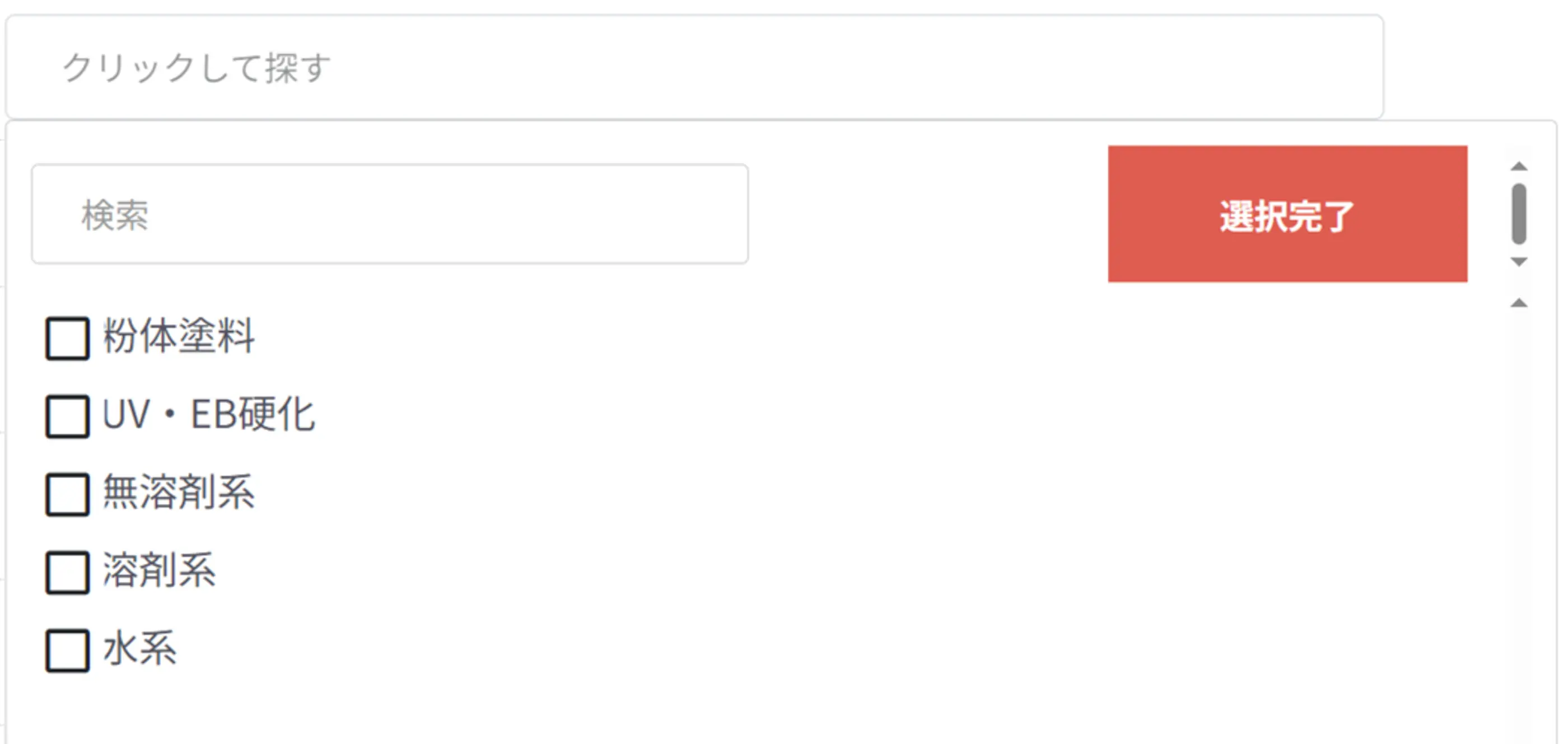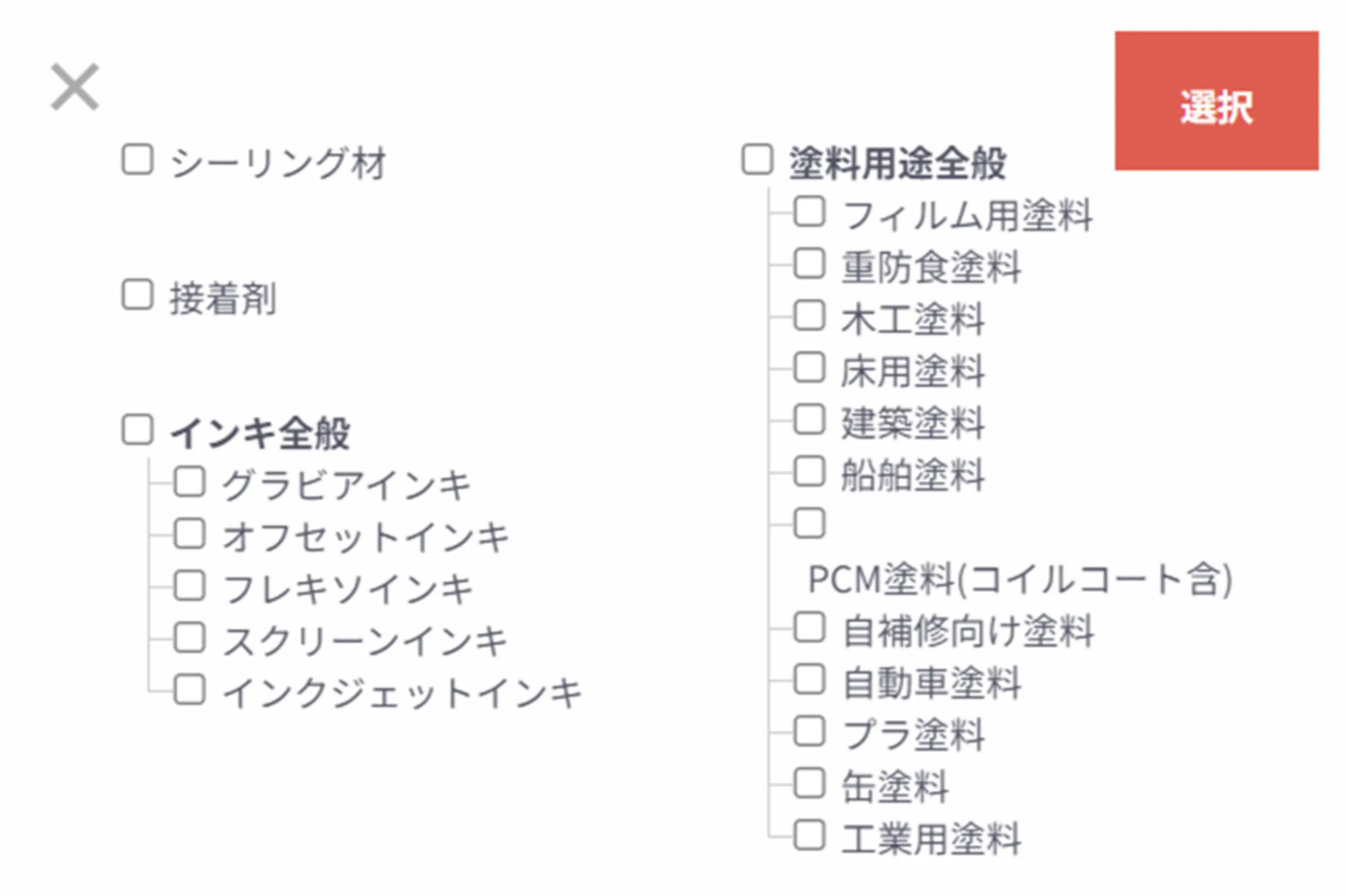 水系、溶剤系、無溶剤系、UV硬化系、粉体塗料向けからの検索が可能