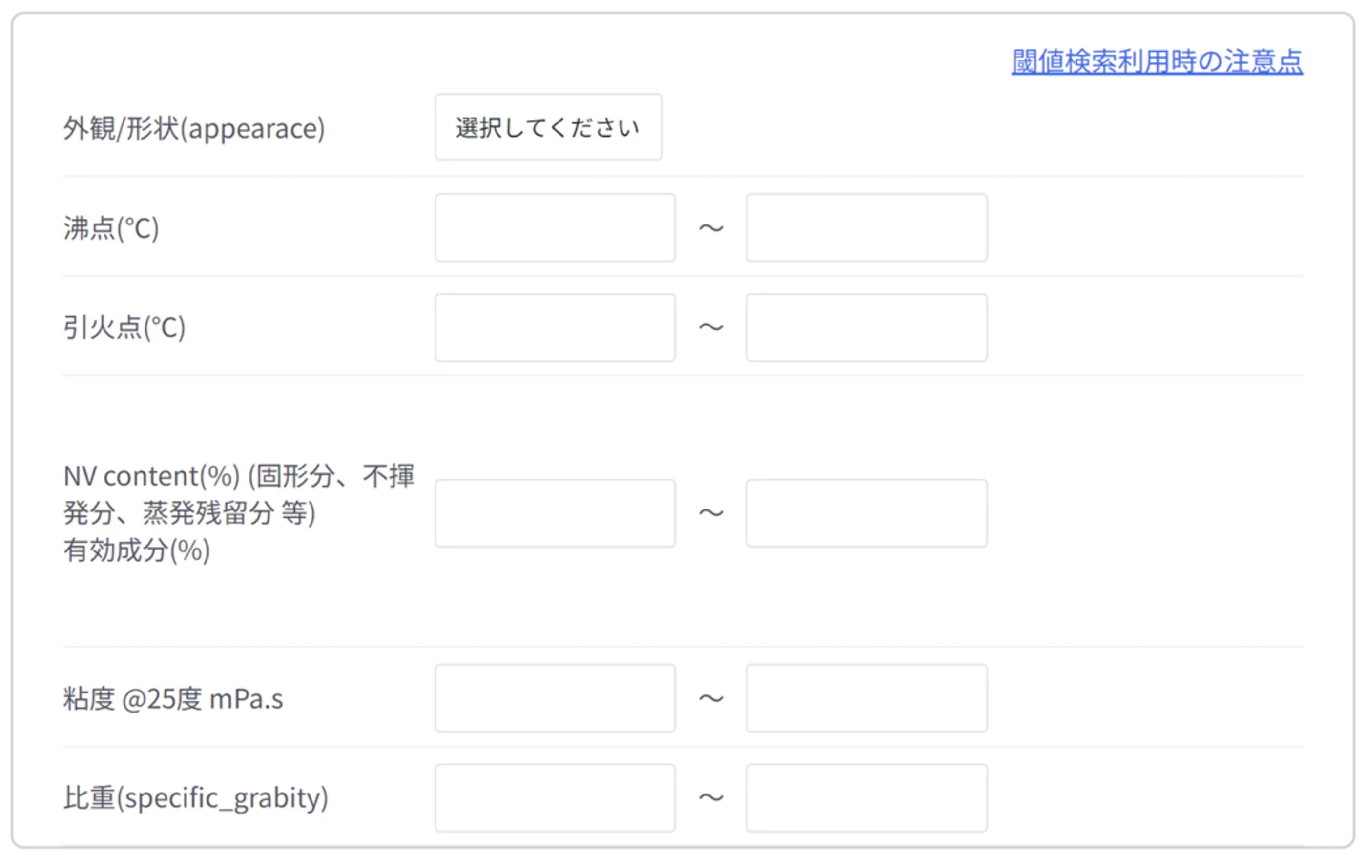 様々な定性的(キーワード)、定量的(製品物性値、規格値)な検索項目から横断的な製品検索が可能で、お探しの原材料を効率的に探し出す事が可能です。