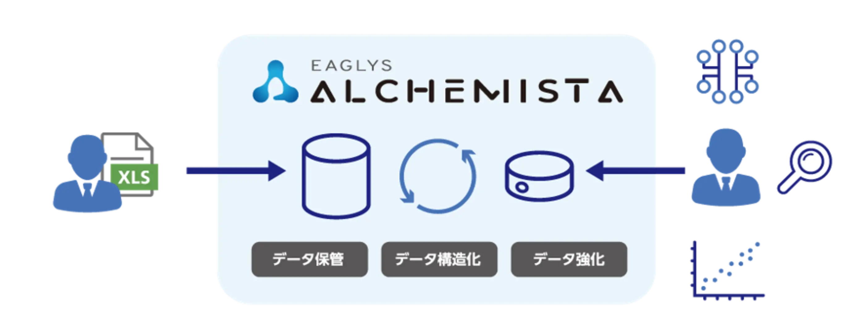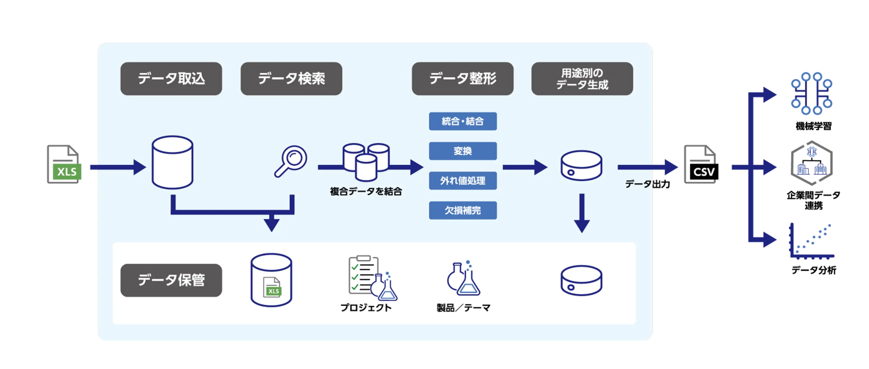Excelに記載された実験データの「取り込み、保管、検索」、MIなどのデータ活用のための「データ整形」といった、データ活用に必要なデータ管理をワンストップで実現します。