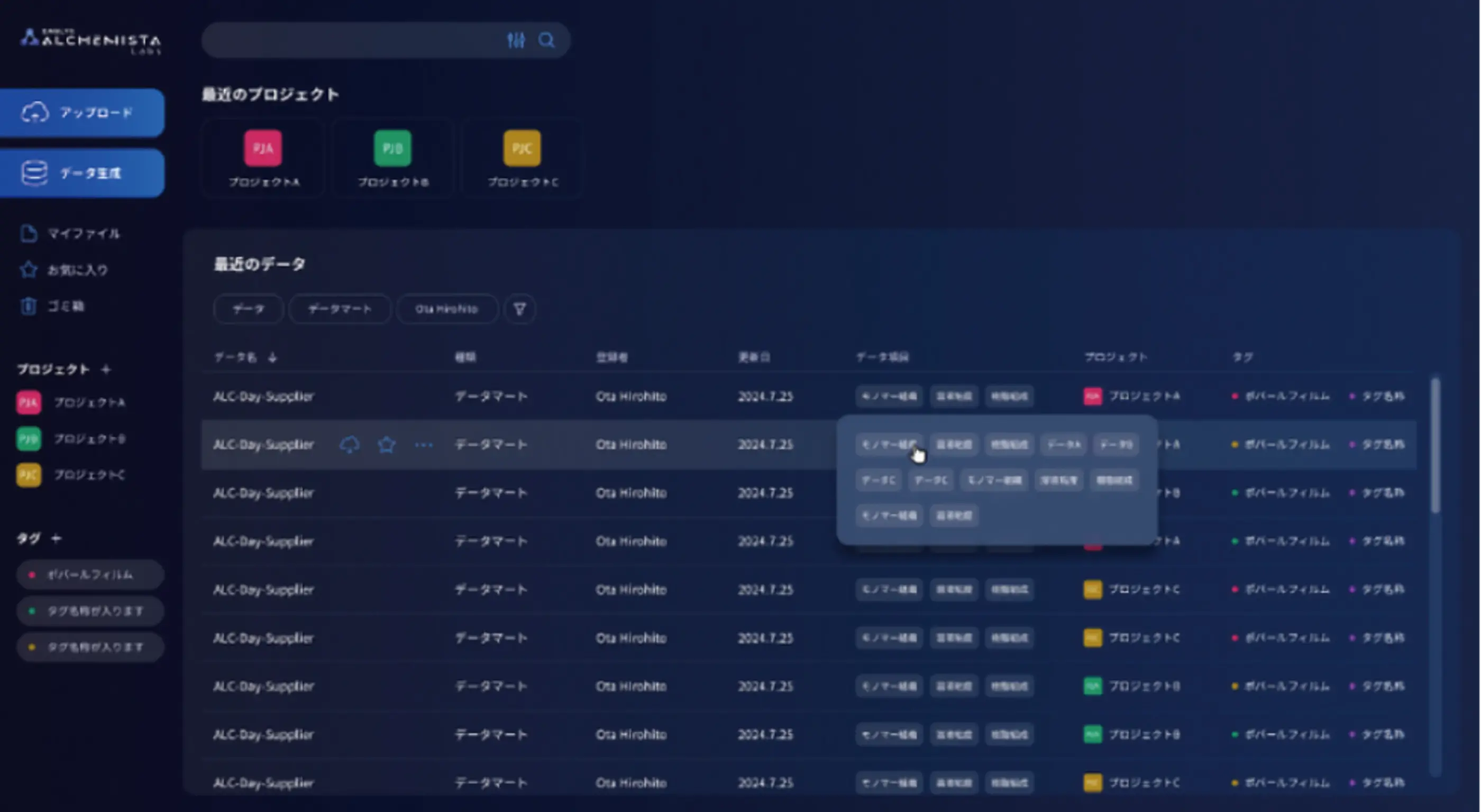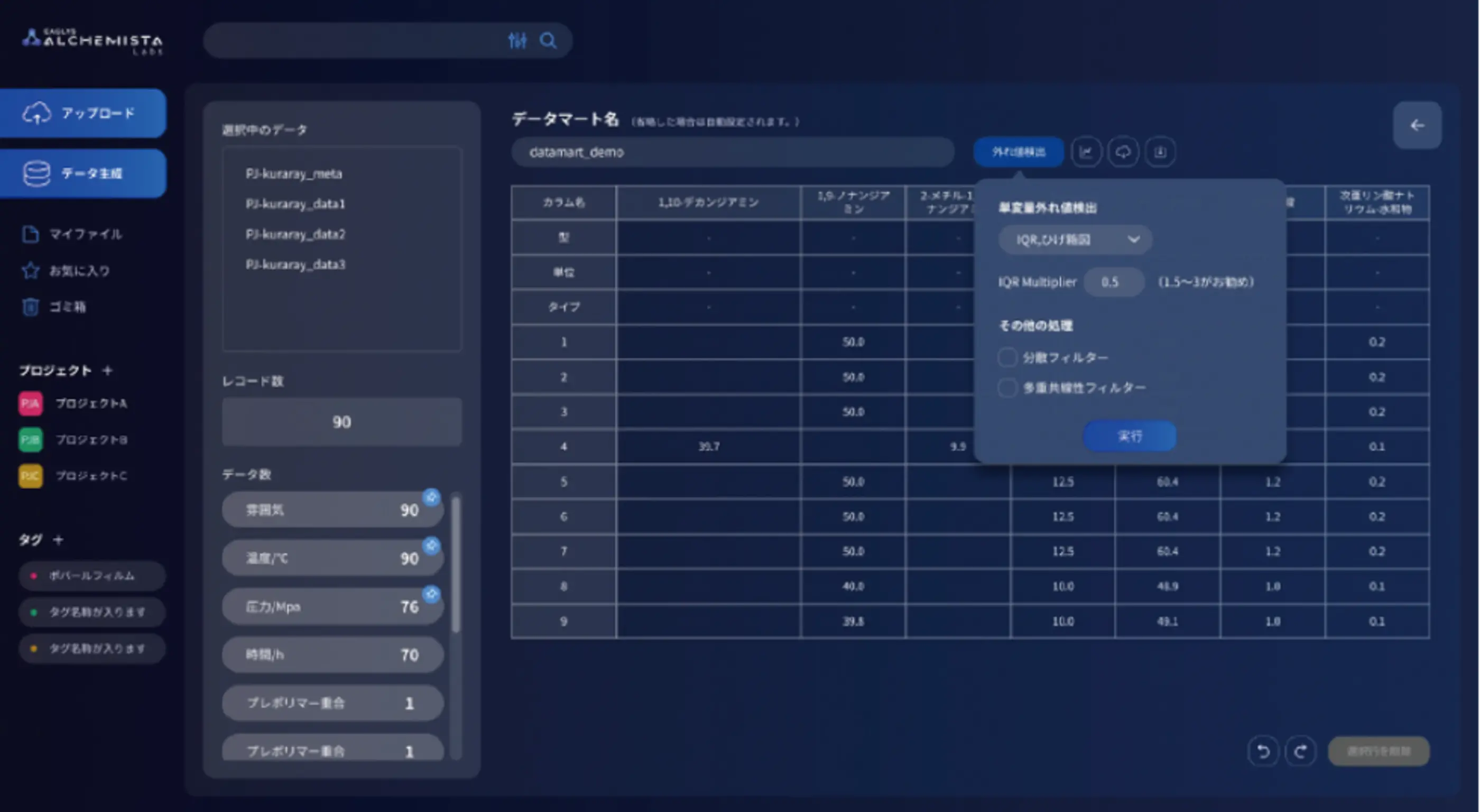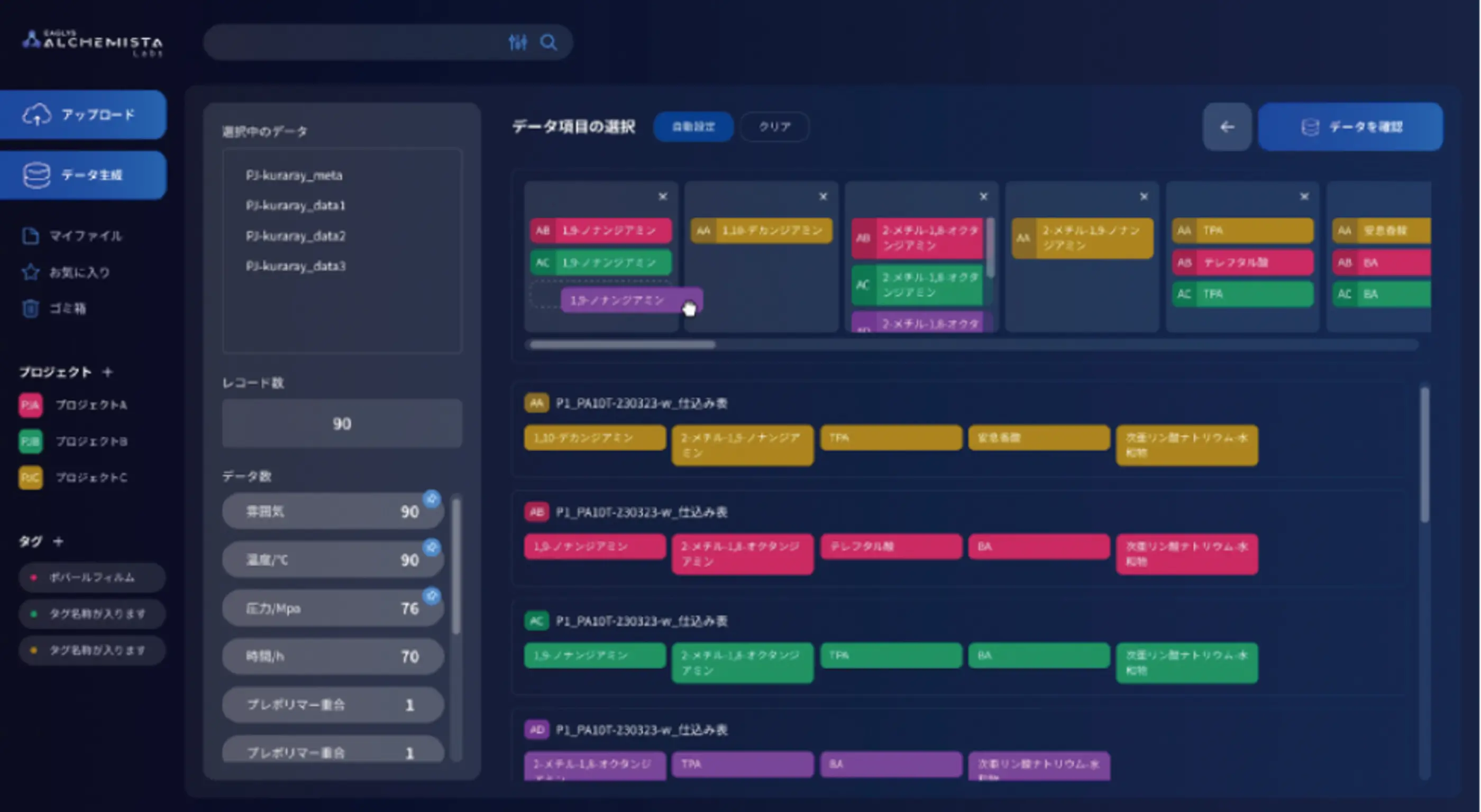 取り込んだ複数の実験データからデータを統合・結合し、機械学習や分析用のデータを生成、CSVで出力することが可能です。項目の表記揺れは独自の操作画面を通じて解消できます。