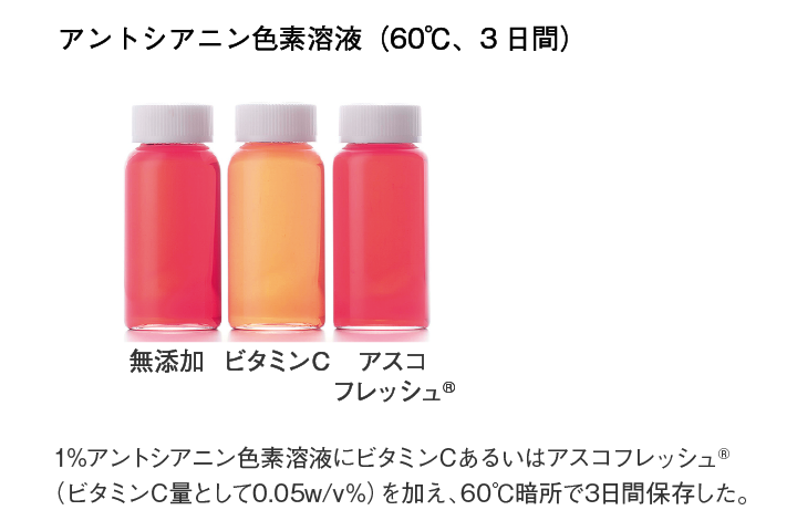 フルーツや野菜などに含まれるアントシアニンはビタミンCと併用すると退色することがあります。アスコフレッシュ®は、アントシアニン色素に影響を与えません。