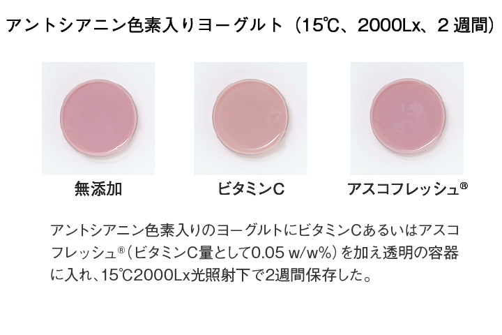 ビタミンCでは退色が進みますが、アスコフレッシュ®は退色を促進しません。