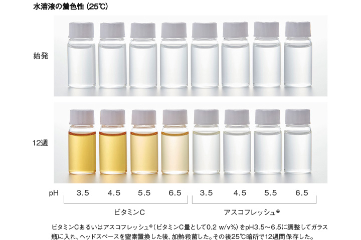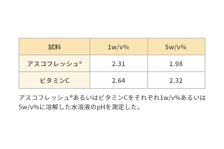 アスコフレッシュ® は、同濃度のビタミンCに比べ、水溶液でのpHはやや低くなります。