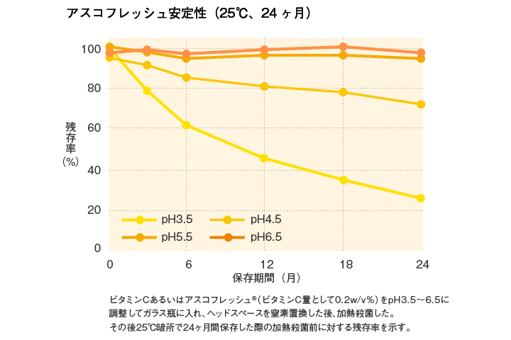 アスコフレッシュ®の水溶液(弱酸性~中性域)は、長期間保存した場合でも、ビタミンCに比べ高い安定性を示します。