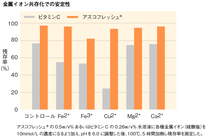 アスコフレッシュ®は、ビタミンC分子の2位水酸基がグルコース分子で封鎖されているため、酸化・還元性を示しません。そのため、金属イオンの存在する酸化的条件に対しても極めて安定です。