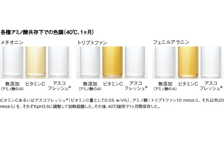 アスコフレッシュ®はアミノ酸との反応性が低いため、アミノ酸共存下においても着色や分解、臭いの発生が起こりにくく、アミノ酸の安定性にもほとんど影響しません。