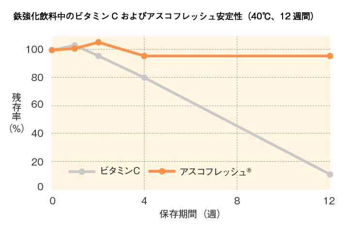 アスコフレッシュ®は非還元性であり、3価鉄と組み合わせても安定です。3価鉄は2価鉄に比べ、鉄味を感じにくいため、飲料や食品によく用いられます。3価鉄をビタミンCと組み合わせると、その還元作用により、すぐに強い鉄味をもつ2価鉄となります。アスコフレッシュ®であれば3価鉄のまま残存します。