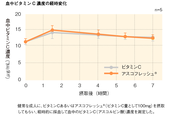 摂取すると、小腸の消化酵素により加水分解を受け、ビタミンCとなって体内に吸収され、ビタミンCとしての効果を発揮します。