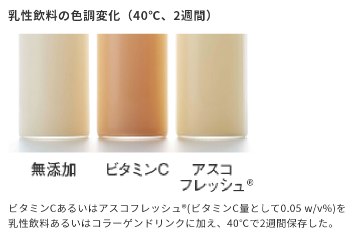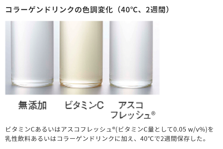 ビタミンCを配合すると着色しやすいコラーゲンドリンクでもアスコフレッシュ®なら色や味を損ねません。