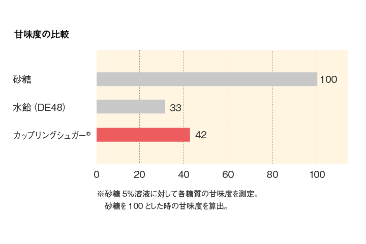 カップリングシュガー® の甘味度は、砂糖の42%と低甘味で、砂糖に似た温和で良質の甘味質を有しています。他の甘味料ともよく調和し、食品の甘さを抑え、素材の味を生かすなど優れた効果を発揮します。