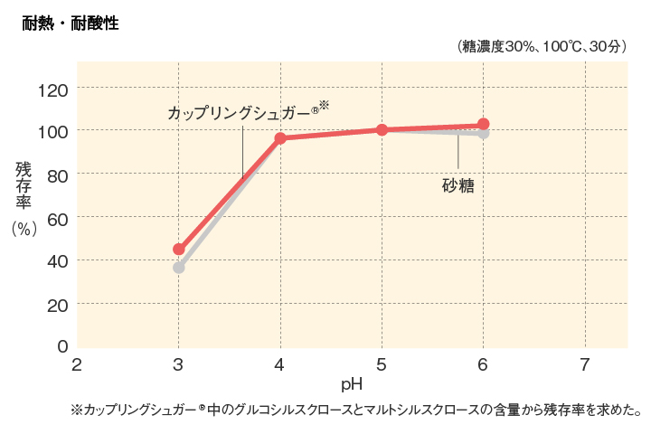 カップリングシュガー® に含まれる砂糖結合物(マルトオリゴシルフルクトシド)の耐熱・耐酸性は、砂糖とほぼ同等であり、通常の食品加工に適しています。