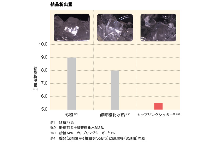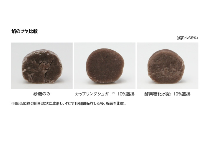 糖割りの高い餡やキャンディで問題となる糖化現象(砂糖の結晶化)には、少量のカップリングシュガー® の配合で水飴以上の抑制効果があります。このことで、砂糖の甘味品位を活かした餡や、歯もろさのある砂糖高含有のキャンディを作ることができます。