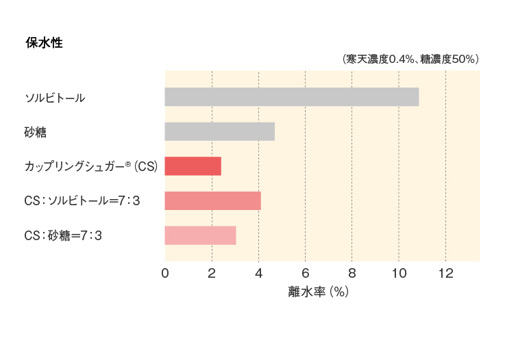 カップリングシュガー® の保水性は高く、特に寒天ゲルの離水防止に効果的です。
