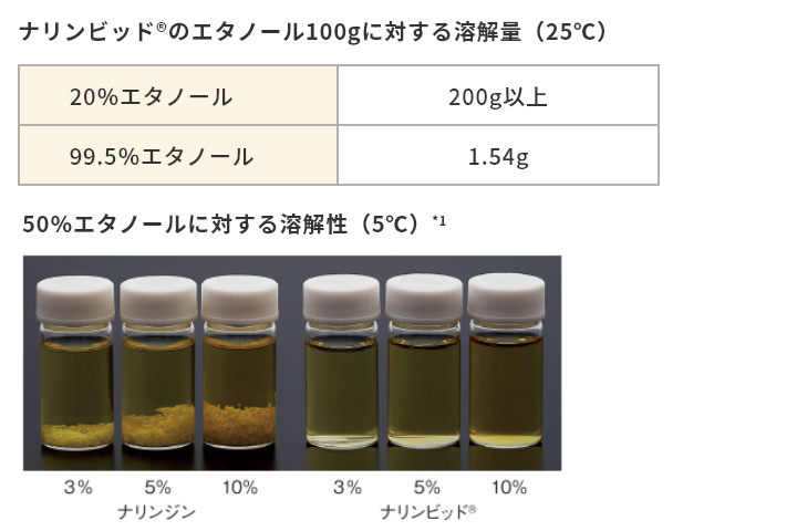 ナリンビッド®はナリンジンに比べてアルコールに高い溶解性を示します。