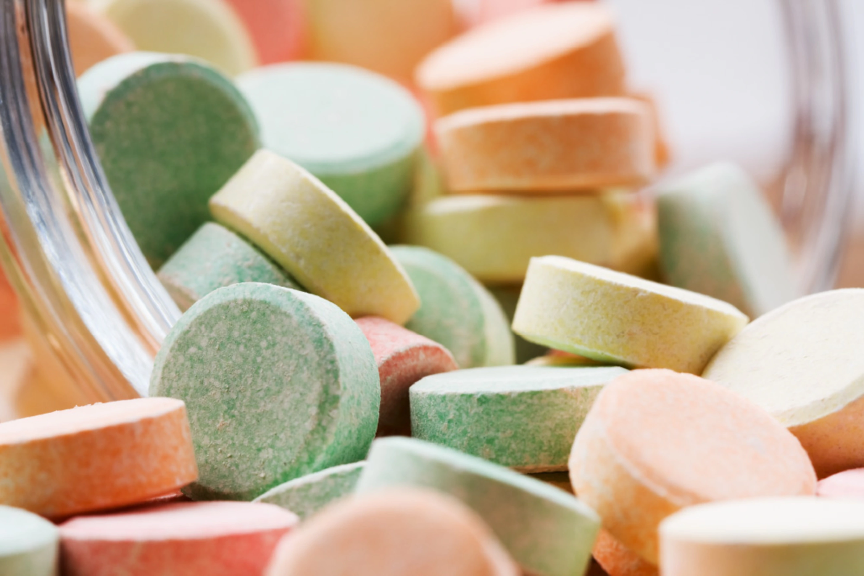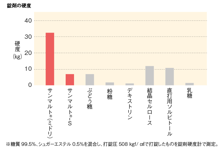 サンマルト®(ミドリ)は、低圧打錠に適した糖質で、成形性の悪い素材の打錠に利用することができます。一方、サンマルト®-Sは、粉体の流動性が良く作業性に優れています。ともに錠菓やトローチなどの直接打錠用の賦形剤として利用できます。