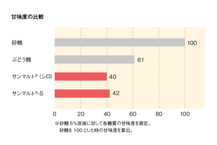 サンマルト®の甘味度は砂糖の約40%と低甘味で、温和で上品な味質を持つ糖類です。砂糖の一部置き換えで低甘味に仕上げることができます。また、砂糖と併用し糖濃度を上げることで日持ち効果を発揮します。