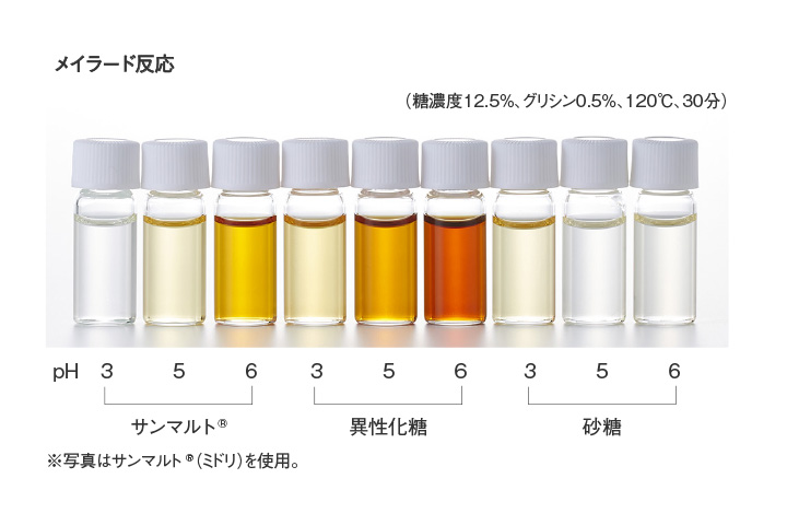 サンマルト®は、アミノ酸やたん白質の共存下で加熱すると着色しますが、ぶどう糖や異性化糖と比較すると低いレベルです。また、加工時の加熱条件や添加のタイミングなどを調節することで、適度な色と風味付けが可能になります。