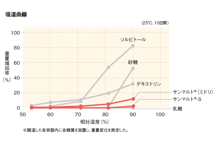サンマルト®は、温度や湿度の変化に対して安定な状態を保てるため、吸放湿しにくい錠剤や錠菓、各種粉末食品の製造が可能になります。