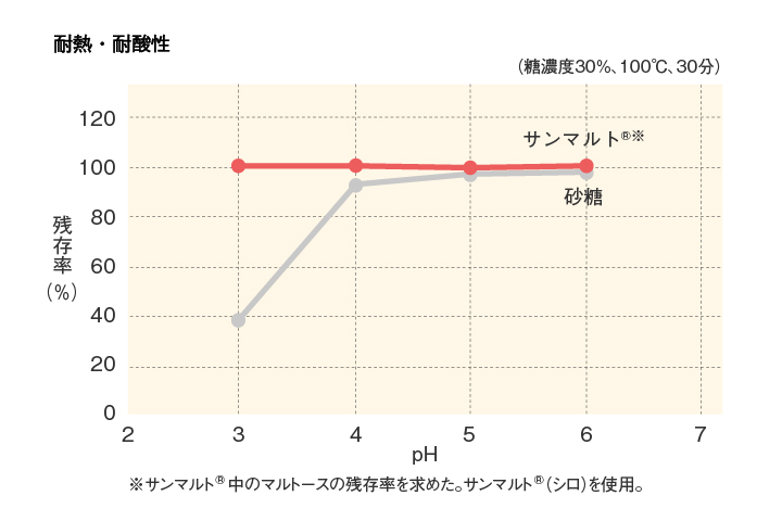 サンマルト®は、加熱や酸に対して砂糖よりも安定しており、加工中に分解や変質する心配がありません。