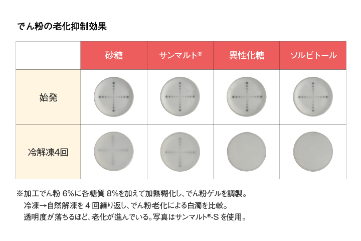 サンマルト®は、でん粉の老化防止効果に優れ、餅、スポンジ、クリーム、タレ、めん類、コロッケなどのでん粉使用食品において効果を発揮します。さらに、この効果は低温下あるいは冷凍下でより顕著に表れ、チルド・冷凍食品の食感の保持にも役立ちます。