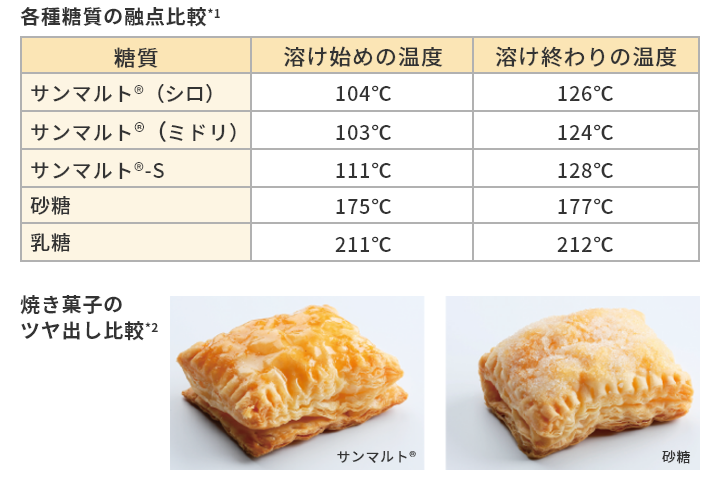 サンマルト®は、砂糖に比べ融点が低いため、食品表面のツヤ出し(グレーズ)やトッピングの結着剤として利用できます。