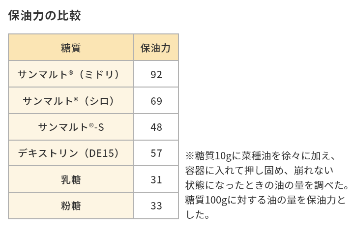 サンマルト®(シロ、ミドリ)は、多孔質な形状で、特にミドリは粒子が細かいため、油脂と混合した際に、多くの油脂を保持できます。そのため、粉末油脂基材などに利用できます。
