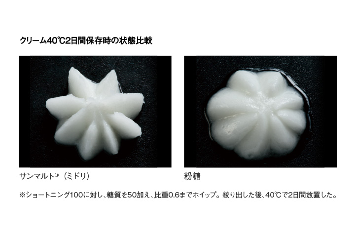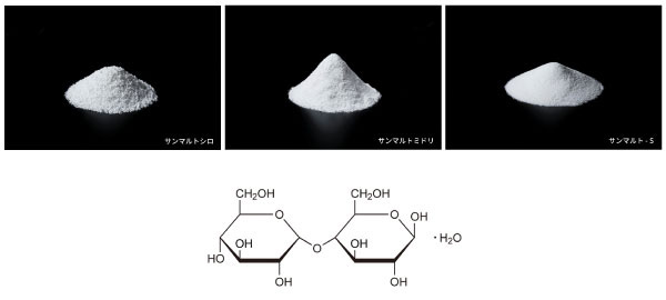 | 効果 | でん粉の老化を抑制し、長期保存や冷蔵・冷凍時の硬化を抑え、柔軟性を保ちます。わらび餅の透明感を維持します。高糖度の場合トレハ®との併用で使用します。 | 砂糖の一部を置き換えることで、甘味低減が可能となります。低甘味でもコクが付与できます。 | サンマルト®(ミドリ)は低圧打錠に適しており、成形性の悪い素材の打錠に利用できます。サンマルト®-Sは粉体の流動性が良く、作業性に優れています。ともに直接打錠用の賦形剤として利用できます。 | サンマルト®の融点は砂糖より低く、この物性を利用することで、パイやクッキーなどの表面にツヤを出すことができます。 | サンマルト®(シロ、ミドリ)は多孔質の粉末で、油を保持させることができます。油脂の粉末化やバタークリームの耐熱性向上に利用できます。また、溶解時の乳化安定性を向上させます。 |