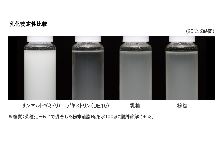 サンマルト®(ミドリ)で粉末化した油脂は水に溶解させると油滴が細かく、乳化安定性に優れています。