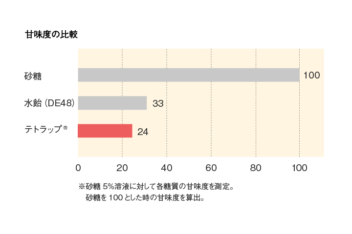 テトラップ® の甘味度は、砂糖の24%と低甘味で、従来の水飴と比べ上品で良好な甘味質を有しています。砂糖の一部をテトラップ® に置き換えることで、食品本来の味を損なうことなく低甘味化を実現します。