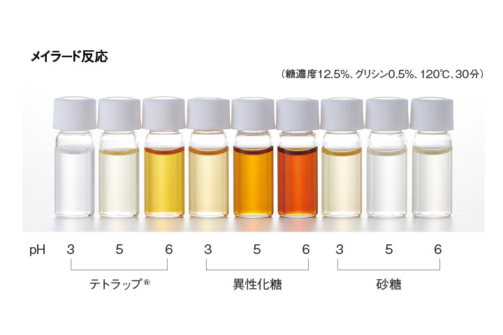 テトラップ® は、ぶどう糖や異性化糖などに比べ、食品中のアミノ酸・たん白質との反応による褐変(メイラード反応)が少ない水飴です。