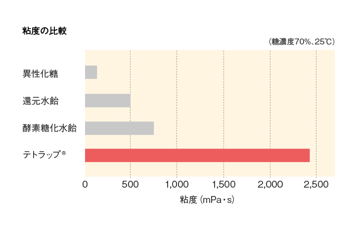 テトラップ® は、デキストリン分が少なく、特有の粘度特性をもっています。糊臭がない水飴として、食感と味質改良などにお役立ていただけます。