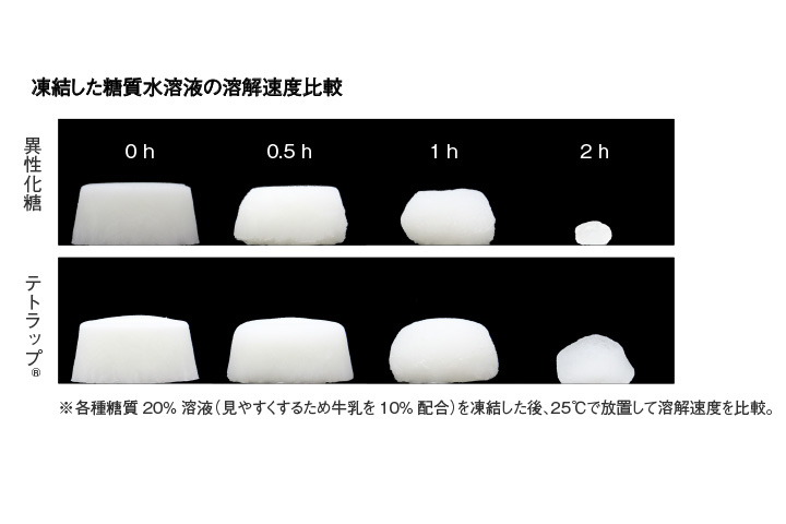 テトラップ® の凍結温度は、異性化糖などに比べて高いため、アイスクリームなどの甘味低減と同時に、凍結温度や溶解速度の調節にご利用いただけます。