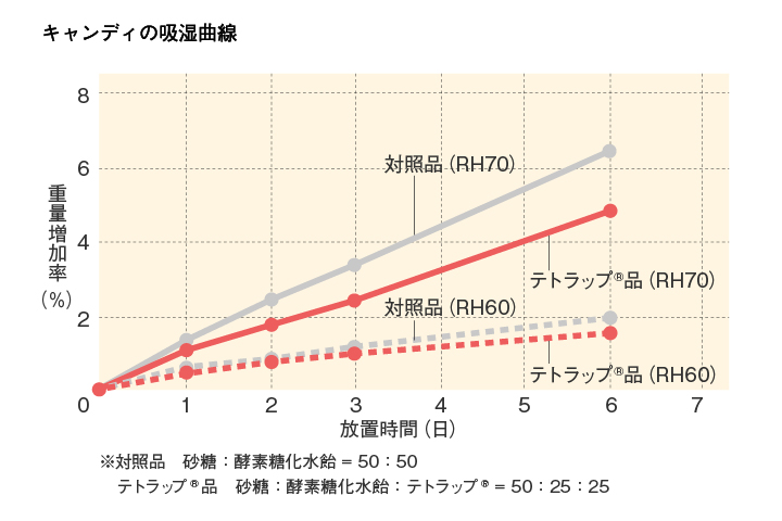 テトラップ® は低吸湿のため、キャンディ類の吸湿やべたつきを抑制します。