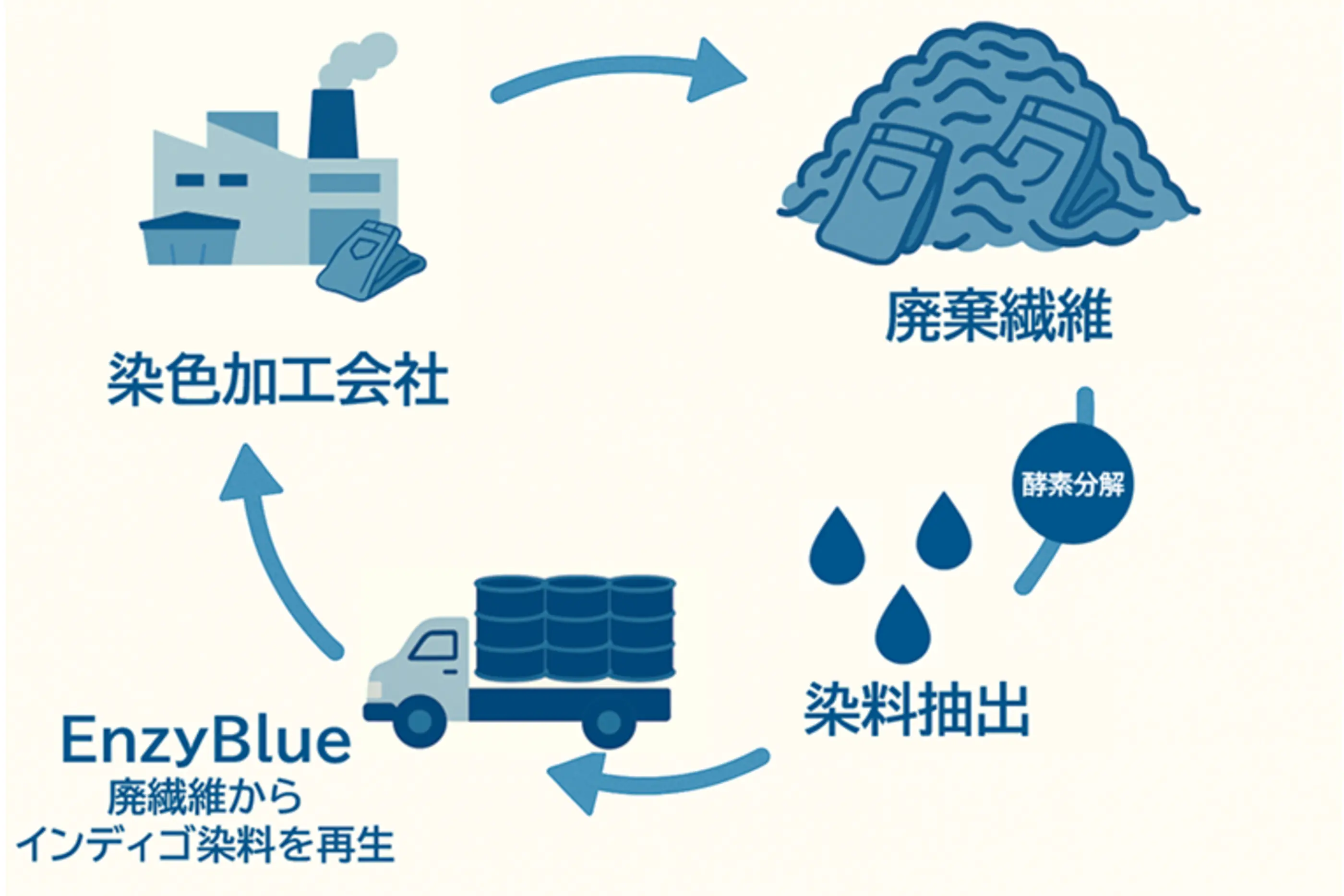 EnzyBlueは、廃棄デニムや古着繊維を酵素の力で分解・抽出し、再びインディゴ染料として活用する革新的なリサイクル技術です。従来は焼却や埋め立てで処分されていた素材を再利用することで、資源の有効活用と廃棄物削減に貢献します。この循環型の製造アプローチにより、持続可能な製造サイクルを実現することが可能です。