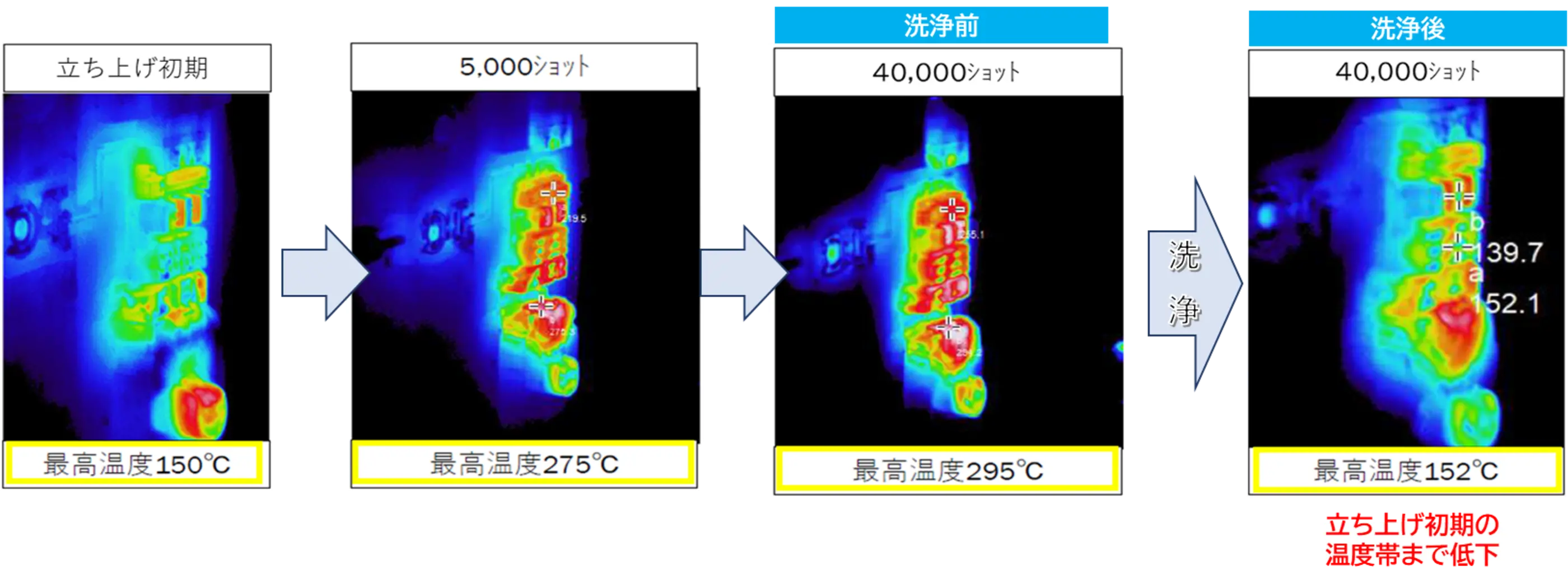 水冷菅内を本製品で洗浄した事により、Al鋳造後の金型温度が152℃まで下がり、立ち上げ当初とほぼ同じ温度になりました。冷却効率が改善し、生産サイクルが短縮。不良率も大幅に減少しました。