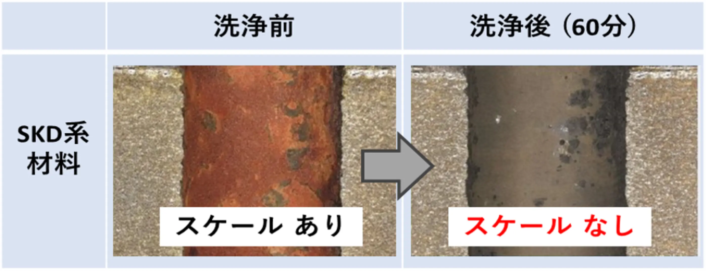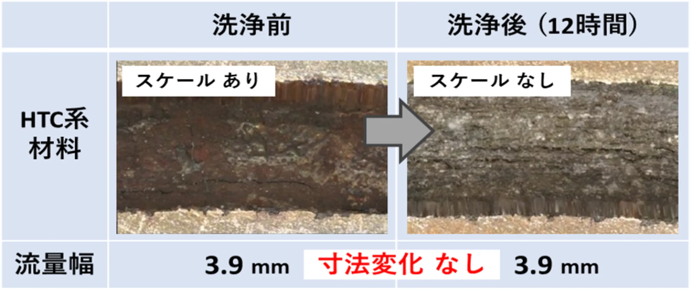 テストではスケールの酷い配管箇所を切り出し、洗浄剤に浸漬させてスケールの除去性を確認した。7時間後に観察した所、スケールの大部分は溶解していた。